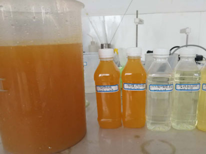 根据业主单位提供的废水典型水质检测报告,废水COD为7030mg/L,TOC为2710mg/L,含油429.1mg/L,氨氮为75.6mg/L,硫化物123mg/L,邻-二甲苯25.44mg/L,pH值6.17,电导率1300μs/cm,另含有少量苯、甲苯、乙苯等苯系物。该废水为淡黄色澄清液体。